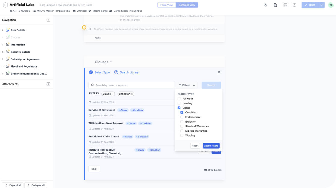Contract Builder is a digital contract building platform that is MRCv3 compliant and leverages editing and formatting features that unify templates across teams and improves broker efficiency. Integrating seamlessly into BMS’s existing ‘Broker Workbench’, Contract Builder empowers BMS teams to merge risk models and legal documents with precise, compliant and automatically populated data, starting with the slip assembly process.