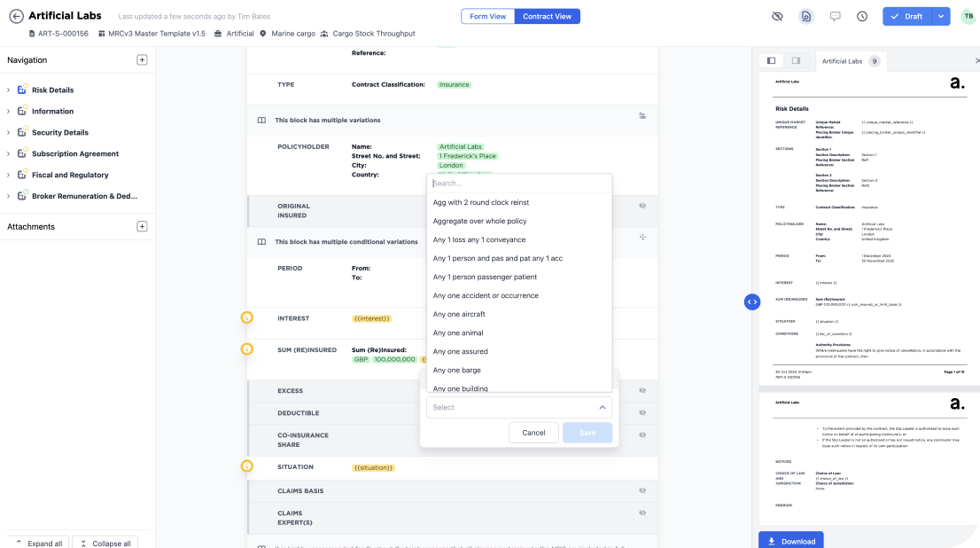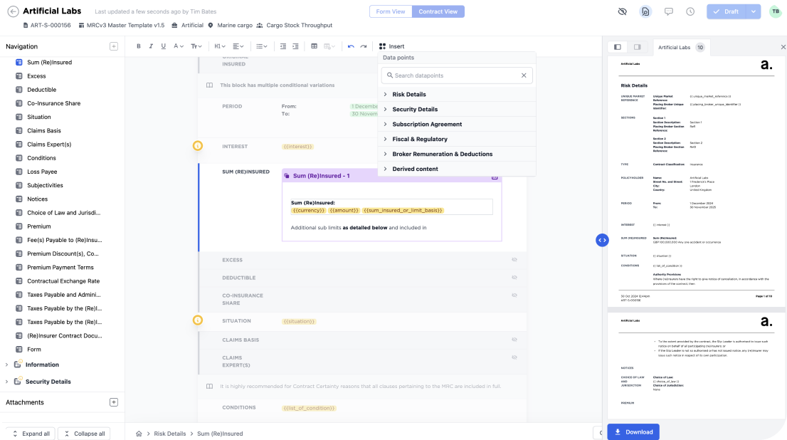 Artificial simplified contract creation while maintaining a familiar interface for brokers. With this in mind, the platform resembles a Microsoft Word document but is powered by their robust data-extraction technology, and market-leading API capabilities.