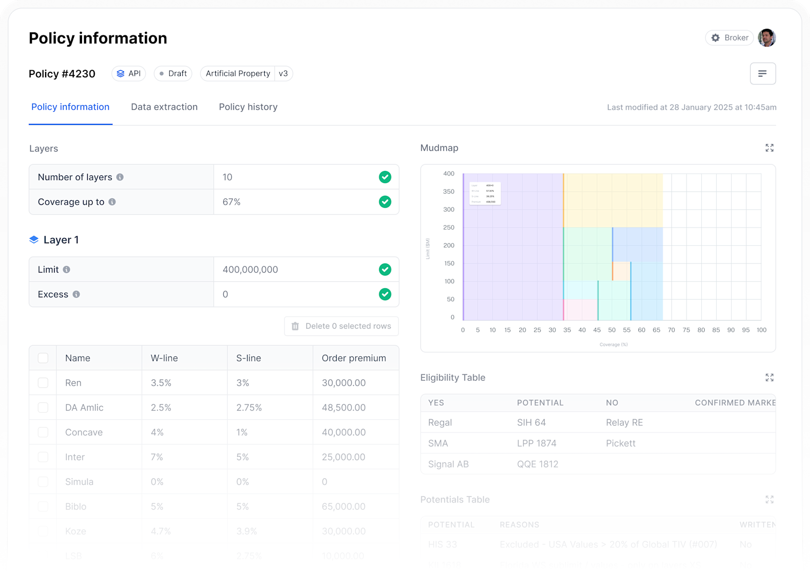 Digitally optimised placement: Codify your placement strategy (no matter how complex) to maximise efficiency across different methods of placement. Our interactive and dynamic 'mudmap' enables brokers to manage complex, multi-layer placements, and our insights tool makes even the most complex placement strategies data-driven, understandable and scalable.